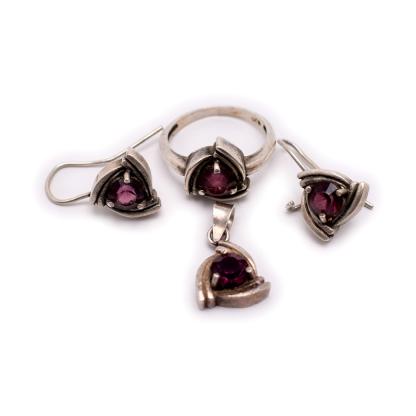 Комплект украшений со вставками. Серебро 925 пробы. 10,4 г. Кольцо 1,8 см, серьги 2,4×1,3 см, кулон 2×1,3 см