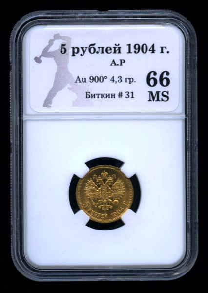 5 рублей — Портрет Николая II 1904 АР. В оригинальном сертифицированном слабе® MS 66 (Российская Империя)