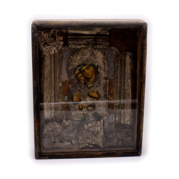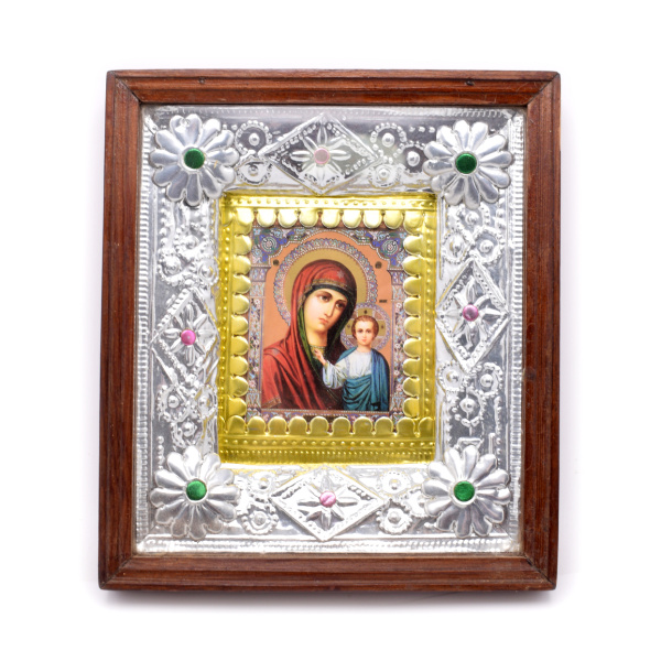 Икона «Богородица с Младенцем» в окладе и киоте. Размер 23,5×29,5 см