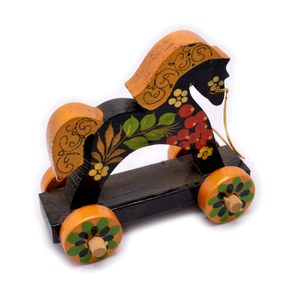 Деревянная игрушка-лошадка на колесах, выполненная в стиле традиционной русской Городецкой росписи. Размер 12×11 см (СССР)