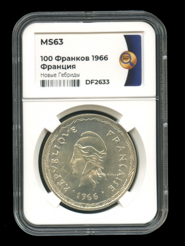 100 франков 1966. В слабе. MS63 (Новые Гебриды)