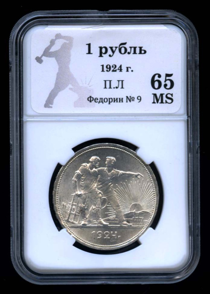 1 рубль — Рабочий и колхозник 1924 ПЛ. В оригинальном сертифицированном слабе® MS 65 (СССР)
