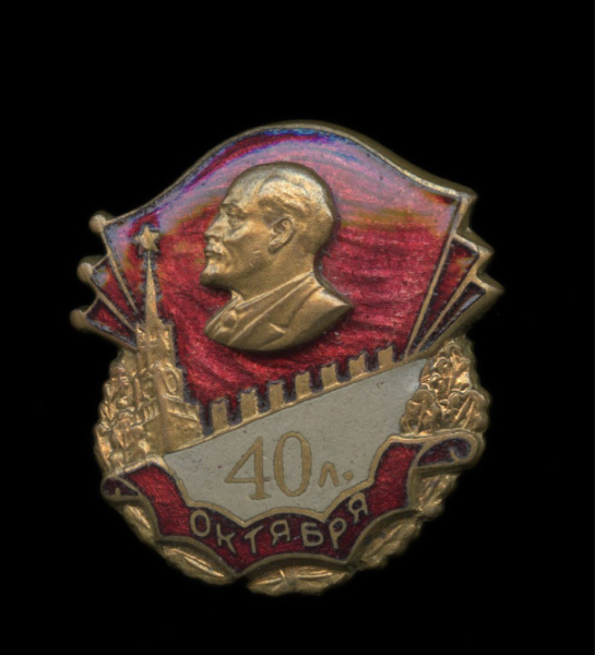 Знак «40 лет Октября». Крепление: булавка. Тяжелый, эмаль. 27×30 мм (СССР)