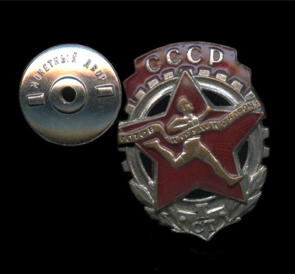 Знак «ГТО. 1 ступень». Крепление: винт. Тяжелый, эмаль. 1940−1946 гг. Бронза, серебрение, 27×36 мм (СССР)