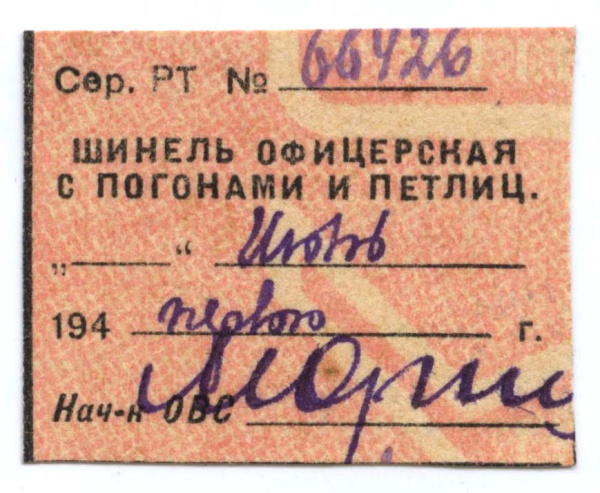 Талон на получение военного имущества — Шинель офицерская с погонами и петлицей. 1941 (СССР)