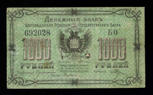 1000 рублей — Денежный знак Благовещенского Отделения Государственного Банка 1920 (Россия: Гражданская война)