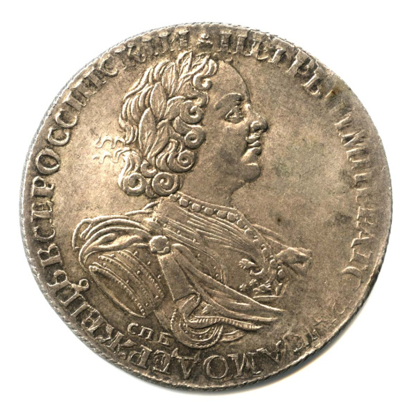 1 рубль — Портрет Петра I Солнечный. В латах. CПБ под портретом. 1725 CПБ (Российская Империя)