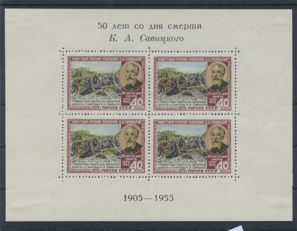 Блок почтовый. Чистый 1955 г. 50 лет со дня смерти К.А.Савицкого. Загорский Бл 15Та (А под Т в слове ЛЕТ) К. Ц 10000р (СССР)