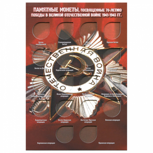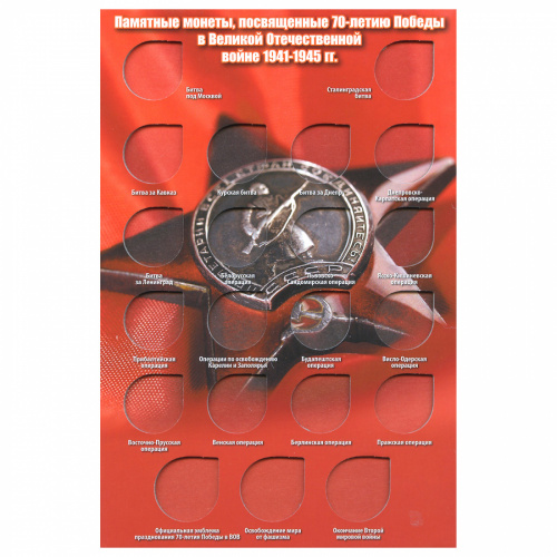 Планшет «Стойка „70 лет Победы“. Для памятных 5 и 10-рублевых монет». Размер 150×225 мм. 21 ячейка (Россия)